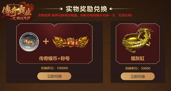 实物奖励有传奇银币、称号或者烟灰缸两种选择,游戏内道具有金砖、元宝、精华等各类奖励,每日限量兑换,先到先得。
