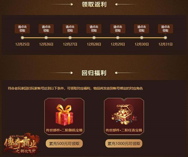 享有老玩家回归白金特权的玩家,绑定角色后(与积分兑换活动绑定一致),活动期间首笔充值可享有海量充值返利,首笔充值100元以上,除当日可立即领取返利外,后续每天仍可领取当日充值获得的返利,最高可连领7天,畅享海量返利。
