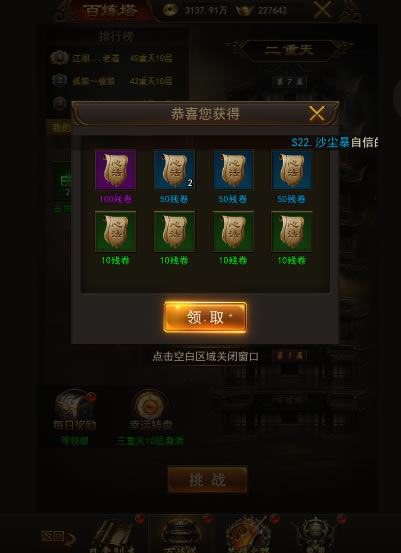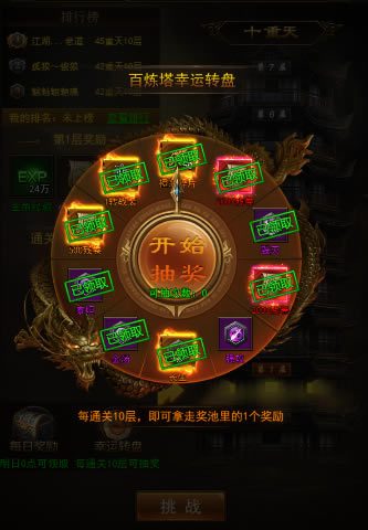 每通关10层,即可自动弹出百炼塔幸运转盘,点击开始抽奖,即可拿走奖池里的1个奖励。心法、心法残卷、橙装碎片……都将是你的囊中之物。