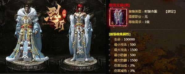 此次新服活动中,全新的时装“踏雪无痕”已上线展示,本次时装男女时装属性相同:生命值、最小攻击、最大攻击、最小防御、最大防御、伤害加成及伤害减免均有相应的属性加成。