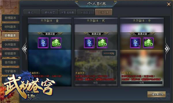 开服第一天,你可能会为游戏中不能获得精品首饰犯愁,但在37《武动苍穹》中,通关剧情副本,即可获得首饰装备奖励,同时还有大量经验铸币奖励!每天还可扫荡已经通关的副本,也可获得大量的经验铸币奖励哦!
