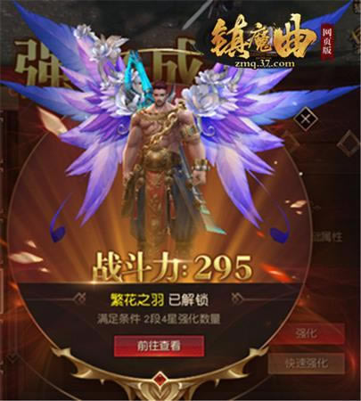在37《镇魔曲网页版》中,通过主界面的外观按钮,打开外观界面,选择翅膀页,即可查看翅膀。当角色达到48级后,将会自动开启强化系统,通过达成指定强化条件,可解锁翅膀。
