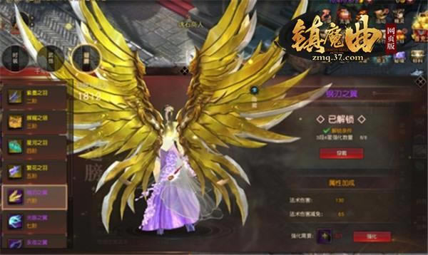 已经解锁的翅膀通过强化可提升属性,在37《镇魔曲网页版》中,五阶及以下的翅膀可使用【乌凤翎】强化,【乌凤翎】可以在演武商店购买。六阶及以上的翅膀使用【魔龙残翼】强化,可通过商城购买。
