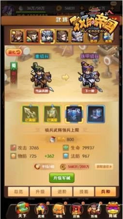 当37《我的帝国》里的主公等级达到80级时,可开启兵种系统,不同的武将所携带的兵种也不同。消耗兵符和铜币可升级兵种,当升级达上限时,需通过突破令和铜币对兵种进行突破。兵种突破后能够大幅度增加各项属性和武将的领兵上限。