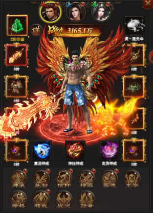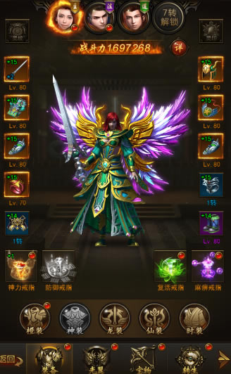 游戏中,完整的装备系统由装备、光翼、宝物、转生与炼魂系统组成,而装备系统又包含了橙装、神装、龙装、仙装和时装。穿戴前四种装备将会分别获得额外的技能,而穿戴时装将获得不同类别的称号。