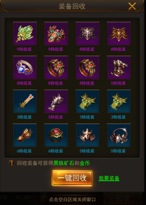 如果背包满了,系统会自动询问是否需要回收装备,玩家点击回收装备后即可一键回收多余的低等级装备。回收装备可获得大量经验、金币以及强化材料。