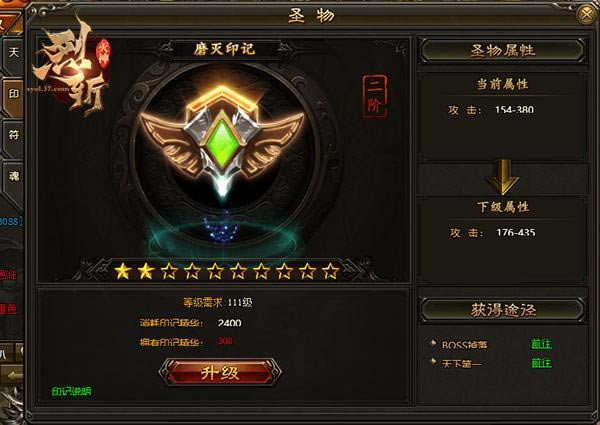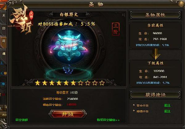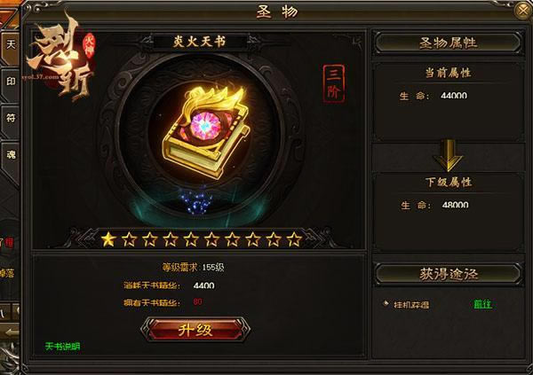 在37《烈斩·灭神》中,天书可增加角色的生命值,消耗天书精华可升级天书星级,升满十星后可以进阶获得更高属性,天书精华可以通过挂机打怪掉落。