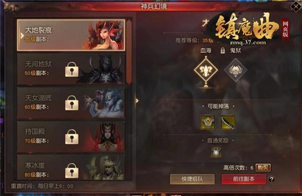 在37《镇魔曲网页版》的神兵幻境中目前有11个副本,每一个副本都有等级要求,玩家必须达到要求才可进入挑战,击杀副本中的小头目和领主,即可获得奖励,每个副本都有【血海】和【鬼狱】两个难度,想要挑战【鬼狱】难度则先要通过【血海】难度,副本难度越大,奖励则越高。