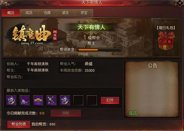 假如你是加入别人的帮会,在加入帮会后,每天可以领取一次帮会礼包。在37《镇魔曲网页版》中,玩家每天可在帮会仓库捐献5次装备,获取帮贡,切记,只有紫色及以上品质的装备才能捐献哦!帮会成员则可以使用帮贡竞拍捐献的装备,当竞拍时间结束后,出价最高的成员可获得。