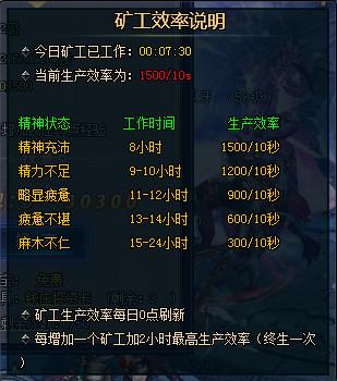 37《绝世仙王》钱庄系统的矿工效率能非常直观地告诉你现在的工作状态,和现实生活中一样,人的精力是有限的,工作时间越长,工作效率就越低,而铜钱在游戏内使用量非常大,所以不要以为工作时间越长越好,大家要记得定期收取钱庄内的钱哦!