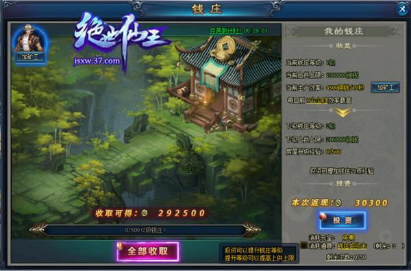 在37《绝世仙王》中,玩家可通过游戏主界面右下部的【钱庄】图标进入钱庄系统,现在钱庄系统的功能已经非常完善,玩家可在界面可查看当前钱庄等级、存钱上限、生产效率、存满剩余时间等,各项功能一目了然,操作简单,十分便民。