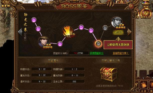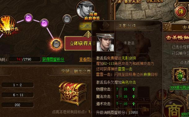 我们再回到触龙之卷,看第12级才能激活的无影剑侠。一旦激活,可以增加62到113的角色攻击力和战神攻击力,还可以获得神技雷霆一击。傲天金装传奇里雷霆一击会有什么样的作用呢?它闪现到目标身边并麻痹目标,有点麻痹戒指的效果。拥有无影剑侠还可获得物理攻击、魔法攻击、道术攻击等加成。只不过,想要达到12级,玩家则需要消耗图鉴积分13950。