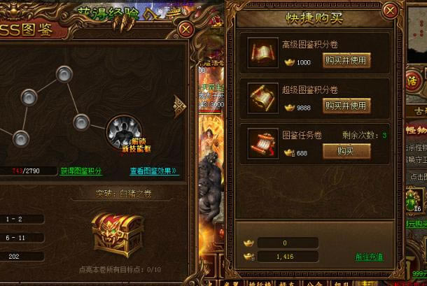 什么高级图鉴积分卷,超级图鉴积分卷,这一切好像都是土豪们的专利。至于小编,只好选择最后一个图鉴任务卷消耗绑定元宝每日购买三个。每个任务卷完成后大约可以收获1500图鉴积分,加入傲天金装传奇的小伙伴们一定要在BOSS图鉴系统中加油努力喔!