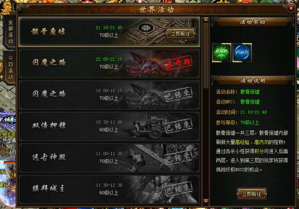 作为每天重要的世界活动,骸骨废墟的活动时间是在晚上的9:10~9:40。需要提醒傲天攻沙加强版小伙伴们的是:等级必须在70级以上才有资格参与,时间只有半个小时,一定要把握好时机喔。