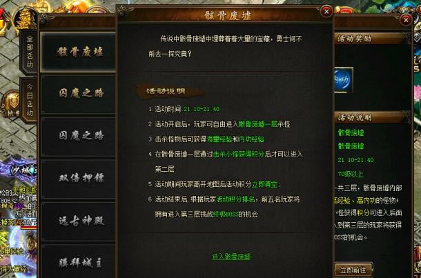 进入骸骨废墟之前,傲天攻沙加强版系统会给到你什么样的启示?传说中的骸骨废墟埋藏着大量宝藏,勇士们何不前去一探究竟呢?我们首先进入的是第一层,击杀小怪进入第二层是当前的小目标。活动期间如果玩家擅自离开地图,活动积分随即清零。