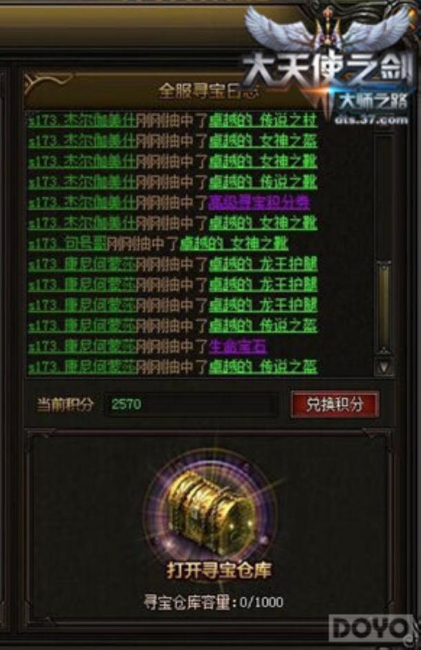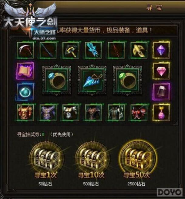 在37《大天使之剑》中,每次寻宝需要花费50个钻石,寻宝除了能够获得各种极品装备、道具,还能获得大量的货币,而且每次寻宝都可以获得相应的积分,可以兑换自己心仪的装备,当然这些都是以大量钻石为基础。寻宝系统非常适合游戏时间少的玩家,花点小钱快速获得装备,当然非R玩家也不要认为37《大天使之剑》的这个系统会拉开R玩家与非R玩家的差距,寻宝系统目前最高击级别的装备也就是龙王套装、女神套装、传说套装。虽然可以使一部分人快速获得高级装备,但是对于游戏的平衡来说影响不大。