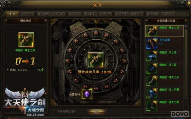 在37《大天使之剑》中,强化预览栏可显示强化之后的图标变化、强化等级变化、属性变化和装备评分变化,强化主界面中间的图标是当前放入装备的图标,四周的骷髅头用以显示强化等级,点燃几个骷髅头就意味着当前装备的强化等级是几级,例如现在有4个燃烧的骷髅头,说明当前装备强化等级为4。强化等级最高为13级,在强化装备栏中会显示背包中可强化的装备,玩家双击即可选中想要强化的装备,强化需要消耗宝石和货币。使用绑定材料强化的装备也会绑定,勾选掉即可不使用绑定材料,强化所需材料和金钱足够时,玩家可点击此按钮进行强化。强化成功则装备强化等级提升,强化失败则装备会扣除一定的强化等级。