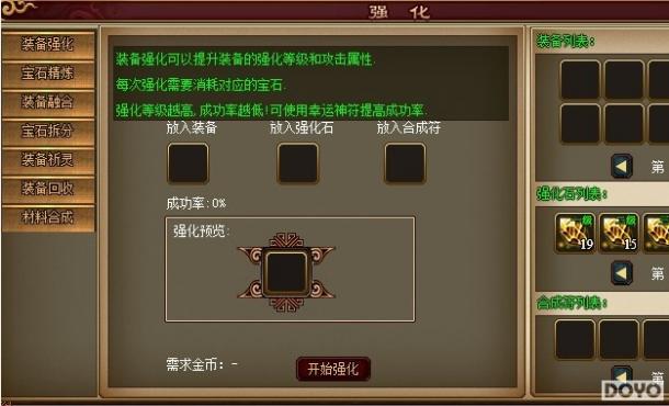 装备强化:是37wan《武尊》熔炉系统最基本的功能,可增强装备的强化等级和攻击,是提升装备能力的重要途径之一。强化装备需要强化石,强化等级越高,自然也需要更高等级的强化石,同时强化的成功率随着装备强化等级的提高,会越来越低。当装备强化等级低到一定程度的时候,就需要用幸运符来提高成功率了。在装备强化过程中,还需要消耗一定的金币。