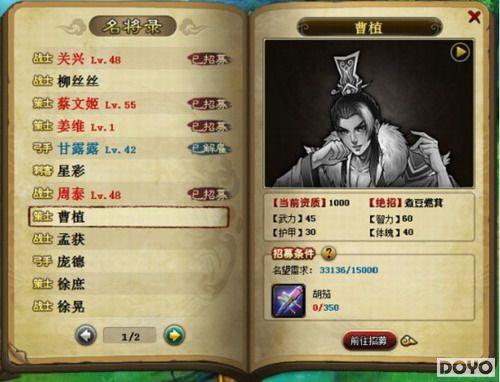 若想在37wan《龙回三国》中将名将招致麾下,必需有足够的名望和喜好品,可以通过游戏里的《名将录》查看各位名将所需的名望和喜好品。
