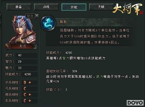赵云的技能发动几率是取决于他的武力,而技能伤害威力是取决于智力。赵云的初始三围分别是武力37、智力26、魅力30.武力37是《大将军》现有武将中最高的之一,完爆其他武将,而智力26也足够傲视其他武力武将,比智力23的张辽足足要高出3点。魅力30点也绝对符合其三国偶像派武将的地位,其三围属性堪称完美!