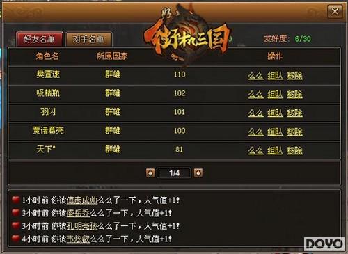 91wan《街机三国》好友活跃度通过对好友或者对手的互动行为增加,活跃度满30可领取活跃度奖励。同时,好友对自己的互动行为将增加或者减少自己的人气值,人气值满30可领取人气值奖励。为了你的活跃奖励,把身边的好友都变成你的基友,一上线就来么么哒,么么哒到高潮!