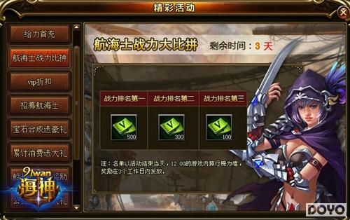 身为新人一枚,在没有熬成大神之前就要玩命做任务发挥一切可能性赚取额外奖励,业精于勤,91wan《海神》提供了足够多的任务供新人历练,同时凭借活跃度给予适当奖励。完成日常任务领完活跃奖励之后,玩家们应以用光每日精力为原则,更不可浪费了每日都要领取一次的爵位、声望、竞技排名等白花花的福利。