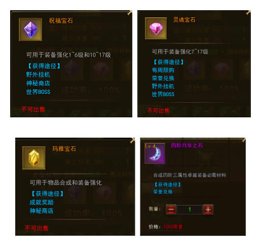 强化装备共需四种材料:祝福宝石、灵魂宝石、玛雅宝石、月华之石、以及装备材料。根据测试,全身+11星级装备,输出低于拥有双卓越+幸运一击装备。虽前者战斗力高于后者,实际打BOSS得到结论,后者输出远超前者,所以并不是星级装备就好。