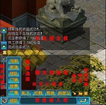 1. 游戏中有8个聊天频道,分别为:当前、密语、组队、门派、帮派、世界和广播。