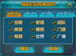 8. 频道设置,点击频道设置按钮,可以设置自定义聊天频道,可以选择查看或屏蔽某个聊天频道的信息,如下图: