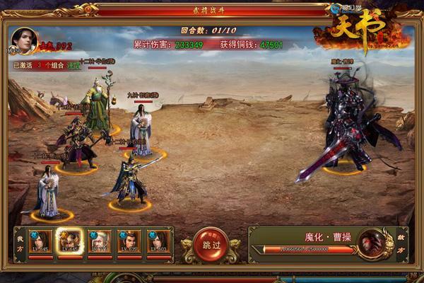 哥们网《天书世界》中,魔化曹操于每天12:00-12:30开启,玩家上阵5名武将轮流前去攻打,每名武将只有一次攻打机会,当曹操发动进攻击杀玩家武将后,武将可在20秒后复活再次轮番攻打,直至曹操死亡。