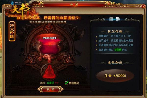 血池是血盾的子系统,玩家们可以通过血菩提(道具)来提升血池的等阶,每次提升都能增加玩家们的血量。而最重要的是,血池等级越高,所需的血菩提数量越少!