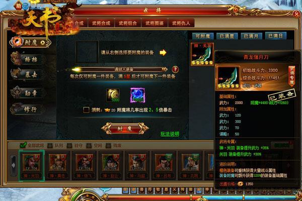旧版本的武将装备附魔上限为五星级,可以为该件装备提供1.2倍的基础属性加成。而新的武将谱中,附魔上限更改为五月级和更高的五日级,五月级的附魔可以为装备提供1.7倍基础属性加成,五日级的附魔更是高达惊人的2.2倍!单件装备的战斗力加成过万再也不是什么难事。