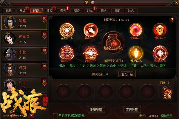 1.英雄提升的方面有等级、技能、霸气、武略,除了不断的提升这几个方面,还可以穿戴胆识,越是金色的,增加的战力越多,当然胆识也需要不断的提升等级,效果才会更好。