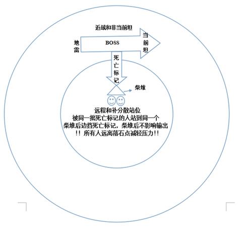 1、开场所有人向同一个方向跑到场地边缘在BOSS两侧站,被点名地雷的去边缘排雷;