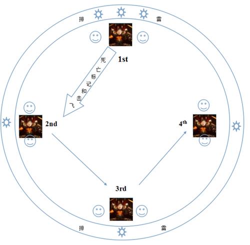 2、死亡标记的人背对中场以免被击飞下台子,其他人闪在一旁不要吃到。