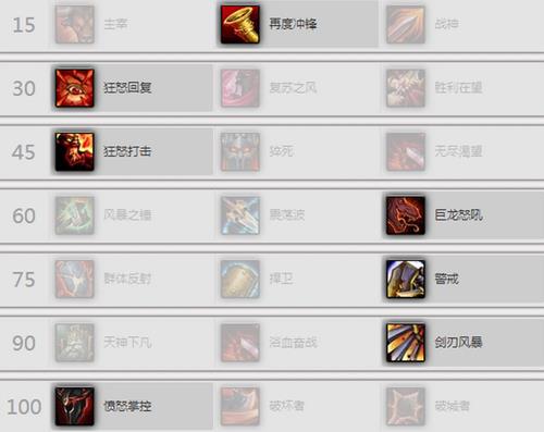 AOE战斗天赋为:再度冲锋——狂怒回复——狂怒打击——巨龙怒吼——警戒——剑刃风暴——愤怒掌控。