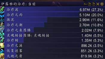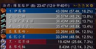 这个BOSS太折磨人了,打了一晚上,终于给过了。奶萨在这场战斗中,注意每次冲击预读条,前期还好,到P2后压力就颇大了,我们采用7治疗打法。治疗是有点多,团队的血有时候还是很难抬,这是个考验DPS和治疗的BOSS,太恐怖!中崩裂注意移动,会出现一朵火,注意不要站在近战范围内,会造成误伤。中炸弹了(在屏幕中间出现红色的按钮)去炸调节器。 到了直接点红按钮,然后马上回原位。中了火BUFF 注意出人群,别伤到其它队友,到了P3 注意移动,有黑泥潭,那时候蓝都空了,又移动频繁,基本只能靠大技能来抬了。之前这个BOSS打到1%(140W,hps-5W8),灭了。这个BOSS还是比较宠幸SM的,HPS比较稳定,基本在5.5W+左右。这次是少放了一个奶潮数据,因为技能重复了。